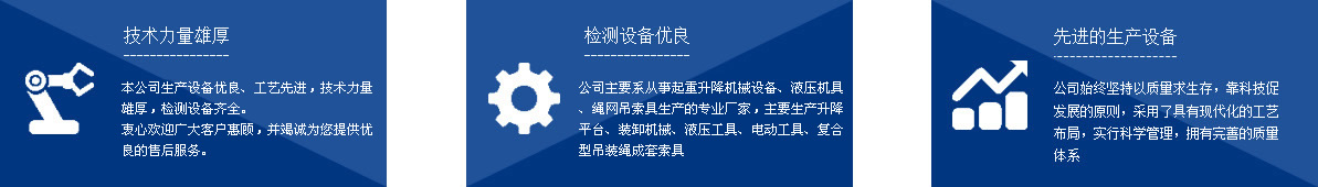 泰州市如意機(jī)械設(shè)備有限公司,座落在中國海軍誕生地江蘇泰州市,緊連328國道,東有鐵路相連,同時有滬寧、寧通高速公路相交,地理位置十分優(yōu)越,自然環(huán)境得天獨厚。 本公司系從事起重升降機(jī)械設(shè)備、液壓機(jī)具、繩網(wǎng)吊索具生產(chǎn)的專業(yè)廠家,主要生產(chǎn)千斤頂、液壓拉馬、軸承加熱器、升降平臺、裝卸機(jī)械、液壓工具、電動工具、復(fù)合型吊裝繩成套索具、高強(qiáng)纖維柔性吊裝帶、起重鏈條成套索具、橫梁吊具、注塑繩、軟梯、安全帶、安全網(wǎng)等幾大系列、上百種規(guī)格的產(chǎn)品,廣泛應(yīng)用于電力、油田、大型鋼廠、機(jī)電、化工、航空、冶金、機(jī)械、鐵道、造紙、港口、建筑等領(lǐng)域。 本公司生產(chǎn)設(shè)備優(yōu)良、工藝先進(jìn),技術(shù)力量雄厚,檢測設(shè)備齊全,其中升降平臺、千斤頂、吊具、加力扳手、液壓矩扳手經(jīng)泰州質(zhì)量技術(shù)監(jiān)督局監(jiān)督檢驗 ...[點擊詳情]